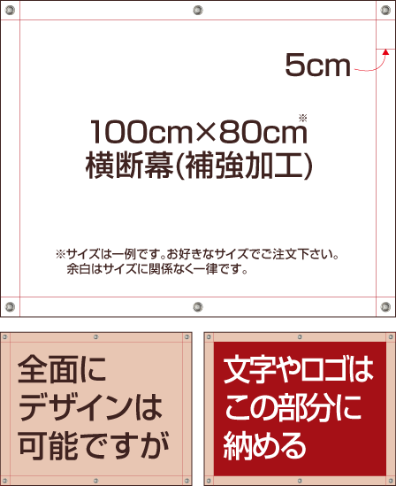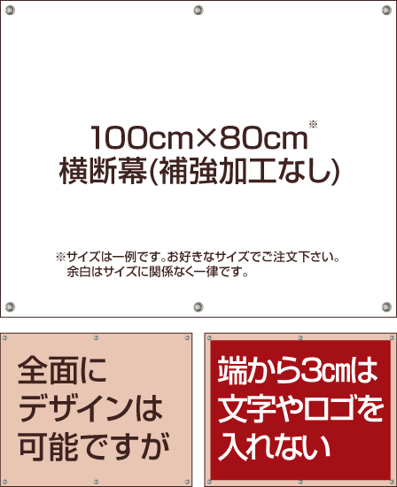 | 端から3cmの鳩目のある範囲は文字.ロゴ.デザインの主要な部分は配置できません。 |